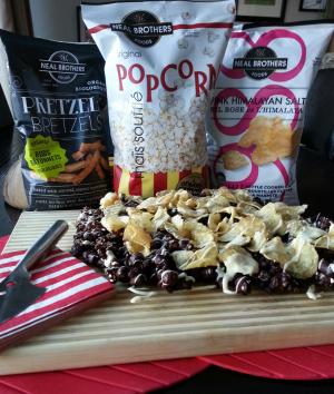 In large microwave proof bowl, melt dark chocolate; add Neal Brothers Original Popcorn, Pretzel Rods and cashews, stir well.